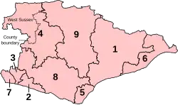 - ^ Vote shares exclude the cross-county constituency of Mid Sussex, which has a predominantly West Sussex electorate