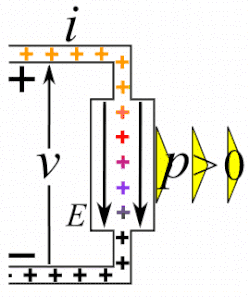 Illustration of the "reference directions" of the current , voltage , and power variables used in the passive sign convention. If positive current is defined as flowing into the device terminal which is defined to be positive voltage, then positive power (big arrow) given by the equation represents electric power flowing into the device, and negative power represents power flowing out.