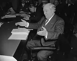 As chairman of the Judiciary Committee, McCarran created and chaired the Senate Internal Security Subcommittee to investigate supposed communist spies and sympathizers within the Franklin D. Roosevelt and Harry S. Truman administrations.[42] In acrimonious hearings in February 1951, McCarran questioned Institute of Pacific Relations researcher Owen Lattimore, whom Senator McCarthy accused of being the "top Russian agent" responsible for the "loss of China."[43][44] During the hearings, McCarran and Lattimore frequently engaged in shouting matches and interrupted one another.[45] At the end of the hearings, McCarran stated Lattimore was "so flagrantly defiant" and "so persistent in his efforts to confuse and obscure the facts that the committee feels constrained to take due notice of his conduct ... That he has uttered untruths stands clear in the record."[43] The subcommittee report written by McCarran concluded that China was indeed "lost" because of the policy followed by the State Department, declaring, "Owen Lattimore and John Carter Vincent were influential in bringing about a change in United States policy... favorable to the Chinese Communists".[45] McCarran was careful not to accuse Lattimore of espionage, which would have allowed him to sue for libel, but came very close with the statement: "Owen Lattimore was, from some time beginning in the 1930s, a conscious, articulate instrument of the Soviet conspiracy".[45] McCarran subsequently pushed successfully for Lattimore to be indicted for perjury.
