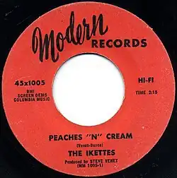 "Peaches 'N' Cream" is the second single from the Ikettes debut album Soul The Hits. Unlike their previous releases which were written and produced by Ike Turner, "Peaches 'N' Cream" was written by Steve Venet and Tommy Boyce; produced by Venet. The record was released on the newly revived Modern Records in February 1965.[1] The single peaked at No. 36 on the Billboard Hot 100 and No. 28 on the R&B chart.[2] It was the best-selling R&B record for Modern in 1965.[3] By the time the album was released in 1966, the Ikettes (Robbie Montgomery, Venetta Fields, and Jessie Smith) had left the Ike & Tina Turner Revue and became The Mirettes.[4]