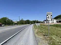 In 1928, PA 41 was rerouted at Lancaster to head southeast to the Delaware state line near Kaolin. The new alignment ran along US 222/PA 72 from Lancaster south and east to Lampeter, where PA 41 headed east through Strasburg to Gap. From Gap, PA 41 ran southeast along the Gap Newport Pike to the Delaware border. At this time, all of PA 41 was paved except for the portion between Strasburg and Gap. PA 240 replaced the PA 41 designation along the US 222 concurrency between Lancaster and Reading.[18] By 1930, the western terminus of PA 41 was cut back to US 222 near Lampeter, removing the concurrences with US 230 and US 222, while the road from PA 41 in Gap north to US 30 was designated as PA 741. By this time, the route was paved from a point east of Strasburg east to Gap.[19] The northern terminus of PA 41 was moved to its current location at US 30 by 1940, replacing PA 741. Meanwhile, PA 741 was designated onto the former alignment of PA 41 between US 222 near Lampeter and Gap.[20] In 1954, PA 41 was rerouted to bypass Atglen and Christiana to the northeast along its current alignment, having previously followed current Fallowfield Road, Main Street, Zion Hill Road, and Newport Avenue.[21][22][23][24][25] By 1959, PA 41 was realigned to the east of Cochranville, having previously passed through the community on current Cochran Street.[21][23]