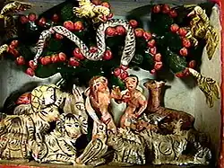 Thus "Peruvian retablo" refers to a "portable altar",[3] populated with figures of saints or other people, animals, beings, and objects, and English-language literature mainly discuss the works of Peruvian-born émigrés based in the U.S. as their craftsmen.[3][4][5] However, the "retablo ayacuchano" is the shorthand used for this genre of artwork in Spanish-language literature.[6][7]