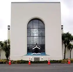 The architecture of the memorial combines Stripped Classical and Art Deco motifs.[8] A central Hall of Memories is flanked by two rooms originally designed as male and female changing rooms for the building's additional original purpose as a bathing pavilion.[8] The building's primary features are a large sand-blasted glass window and a stone replica of the prow of the ship Aurora (the first of the New Zealand Company settler ships to arrive in Wellington) at the base of the window facing the street. On 18 December 1938, Ivor Te Puni, a descendant of chief Te Puni, wrote a letter to the Prime Minister requesting he also remember the Māori people who "gave" one hundred years ago. The result of this letter was the depiction of Te Puni on the stained glass window extending his hand in welcome to the new settlers, represented by a suit-clad man and a woman carrying a child.[9]