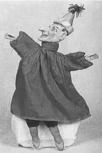 Petrushka (Russian: Петру́шка, IPA: [pʲɪtˈruʂkə] ⓘ) is a stock character of Russian folk puppetry. It was first introduced by traveling Italian performers in the first third of the 19th century during a period of Westernization in Russian culture. While most core characters came from Italy, they were soon transformed by the addition of material from the Russian cultural context.'[1] Petrushkas are traditionally hand puppets. The character is a kind of a jester, a slapstick protagonist distinguished by his red dress, a red kolpak, and often a long nose.