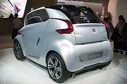 The Peugeot BB1 was a fully electric concept city car that was introduced by Peugeot at the 2009 Frankfurt Motor Show.[2] It incorporated rear in-wheel motors, designed in collaboration with Michelin, each with a maximum power output of 7.5 kW (10 hp) and torque on each wheel of 320 N⋅m (236 lbf⋅ft).[3] The car included four seats, was 2.5 metres (98 in) long and 1.6 metres (63 in) wide.[4][5]