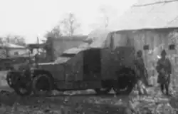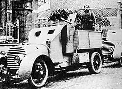 In the early months of the war, commercially acquired Peugeot type 153 tourers were hastily converted to open topped armoured cars by the addition of slab-sided 5.5 mm (0.22 in) thick armoured plates around the crew compartment and an unprotected rear fighting compartment with wooden sides with a central pivot mounted machine gun or 37mm gun protected by a light gun shield, 120 were built.[1][3][4]