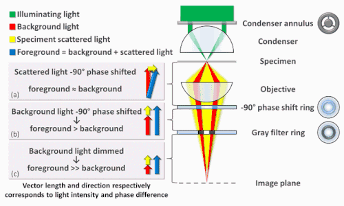 The ring-shaped illuminating light (depicted in green in figure) that passes the condenser annulus is focused on the specimen by the condenser. Some of the illuminating light is scattered by the specimen (yellow). The remaining light is unaffected by the specimen and forms the background light (red). When observing an unstained biological specimen, the scattered light is weak and typically phase-shifted by −90° (due to both the typical thickness of specimens and the refractive index difference between biological tissue and the surrounding medium) relative to the background light. This leads to the foreground (blue vector in accompanying figure) and background (red vector) having nearly the same intensity, resulting in low image contrast.