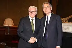 Hammond served in the Shadow Cabinets of Michael Howard and David Cameron as Shadow Secretary of State for Work and Pensions from 2005 to 2007 and Shadow Chief Secretary to the Treasury in 2005 and from 2007 to 2010. After the formation of the Coalition Government in May 2010, he was appointed Secretary of State for Transport and was sworn of the Privy Council. Upon the resignation of Liam Fox over a scandal in October 2011, Hammond was promoted to replace him as Secretary of State for Defence, before being further promoted in July 2014 to become Foreign Secretary.[5][6]