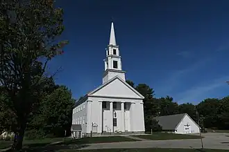 The town common is an irregularly shaped trapezoid, which is mostly grassy, with lines of mature trees at its fringes. There are no buildings on the common itself, with residential and civic buildings lining the roadways that define its boundaries. It is anchored on the north by the Congregational Church, built in 1786 and altered and given Greek Revival styling in 1837, and the south by the town hall, built in 1891 with Victorian Gothic styling. Just east of the church is the town library, formerly a district school; built in the 1830s, it is distinctive for its four-column Greek Revival temple front.[3]