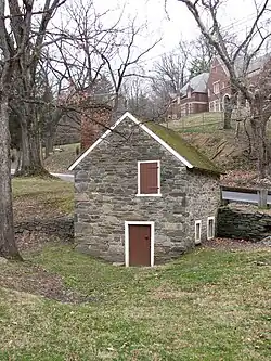 The springhouse, built in 1801, is located in the median of Tilden Street west of the barn.