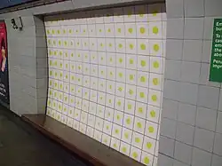 Along with other stations on the Victoria line, Pimlico station features distinctive artwork motifs in the station building.[26] The platform walls are covered with tiles decorated with a series of op art yellow spots designed by Peter Sedgley, who derived it from his 1968 piece, "Go".[27] Sedgley was chosen by Sir Misha Black, who had formed London Transport's Design Research Unit, which oversaw the design of the whole Victoria Line. Black wanted a contemporary artist to create the tiles for Pimlico, because of its closeness to the Tate Gallery, but Sedgley's request that the tiles should be set in a washable grout was ignored, and the grout has become blacker with time because of the dusty air on the platforms.[28]