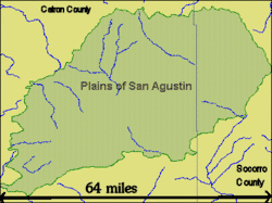 The Plains of San Agustin (sometimes listed as the Plains of San Augustin) is a region in the southwestern U.S. state of New Mexico in the San Agustin Basin, south of U.S. Highway 60. The area spans Catron and Socorro Counties, about 50 miles (80 km) west of the town of Socorro and about 25 miles (40 km) north of Reserve. The plains extend roughly northeast-southwest, with a length of about 55 miles (88 km) and a width varying between 5–15 miles (8–24 km). The basin is bounded on the south by the Luera Mountains and Pelona Mountain (outliers of the Black Range); on the west by the Tularosa Mountains; on the north by the Mangas, Crosby, Datil, and Gallinas Mountains; and on the east by the San Mateo Mountains. The Continental Divide lies close to much of the southern and western boundaries of the plains.[1]