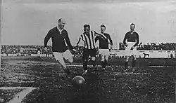 In the summer of 1924, a Plymouth Argyle team visited South America to play some exhibition football in Argentina and Uruguay.[10][11] Argyle thrashed Uruguay 4–0 in the first game (the team which went on to win the first ever World Cup just six years later), before pulling off another shock by beating Argentina 1–0.[12] Argyle then held Argentine giants Boca Juniors to a creditable 1–1 draw. Moses Russell captained the side and played in all nine matches. Russell's style of play caught the attention of the Argentine press; at the end of the tour 'The Standard of Buenos Aires' commented: "The visit of Plymouth Argyle will be best remembered by the outstanding personality and genius of Moses Russell. His effective style, precise judgement, accurate and timely clearances, powerful kicking and no less useful work with his head...one of the most wonderful backs and one of the brainiest players ever seen on the football field."[13]