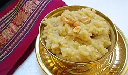 The festival is named after the "Pongal" dish, which forms the festival's most significant practice. The dish is prepared by boiling freshly harvested rice in cow milk and raw cane sugar.[1] Additional ingredients such as coconut and ghee along with spices such as cardamom, raisins and cashews are also used.[8][10] The cooking is done in a clay pot that is often garlanded with leaves or flowers, sometimes tied with a piece of turmeric root. It is either cooked at home, or in community gatherings such as in temples or village open spaces.[8][33] The cooking is done in sunlight, usually in a porch or courtyard and the dish is dedicated to the Sun god, Surya. After it is traditionally offered to the gods and goddesses first, followed sometimes by cows, then to friends and family gathered.[34] Temples and communities organize free kitchen prepared by volunteers to all those who gather.[3][35] Portions of the sweet pongal dish (Sakkarai Pongal) are distributed as the prasadam in temples.[10]