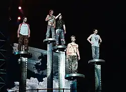 While promoting their performance at Rock in Rio in 2001, the band stated production was underway on their forthcoming tour. Following the performance, SFX Entertainment announced the band was planning a summer concert tour to promote their upcoming album. Band member Lance Bass said the inspiration for the tour's concept was the film 2001: A Space Odyssey, saying, "We wanted to do 2001: A Pop Odyssey and pay tribute to pop icons. So the whole tour revolves around the meaning of pop and what was popular from the '40s til today."[5] Initially, the tour was expected to begin May 12, 2001 at the Pro Player Stadium in Miami,[6] with English pop group BBMak slated to be the opening act.[7] PopOdyssey was considered "the largest production for a pop concert",[8] as the stage was five stories tall and included three video screens and five mini-stages.[9] The tour was then postponed to May 23, 2001, to ensure that the crew was able to complete the stage construction.[10] NSYNC's third studio album Celebrity was initially planned to be released on June 26, 2001,[11] but was moved to July 24, 2001. As a result, NSYNC decided to perform new songs from Celebrity on the tour before the album was released.[12] Additional tour dates were cancelled due to weather conditions in the South.[13] However, PopOdyssey was one of the most anticipated tours of 2001.[14] Two months into the tour, the band expressed hopes of later bringing their shows back to Europe, where they first toured before their American breakthrough,[15][16] in addition to Australia;[17] this did not come to fruition.