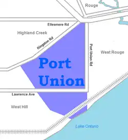Port Union, also known as Centennial Scarborough is a neighbourhood in Toronto, Ontario, Canada. It is located in the south-east corner of Toronto, within the former suburb of Scarborough. The neighbourhood is bounded by Kingston Road to the north, Port Union Road to the east, the Lake Ontario shoreline to the south, and Highland Creek to the west.