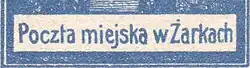 The name of the local post as printed on stamps was Poczta miejska w Żarkach, which translates to English as City post in Żarki.[8] In the Polish language, Żarkach is the locative declension of the town name Żarki.