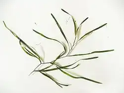 Grass-wrack pondweed is relatively easily distinguished from most other pondweeds by its combination of strongly flattened stems and sclerenchymatous strands in the leaf . P. acutifolius is similar in Europe but can be distinguished by its sharply pointed leaves, less branched habit and flower spikes with only 2–6 flowers on peduncles up to 20 mm long.[4] In the Far East, P. mandschuriensis is an altogether smaller plant, with leaves 1.5–2.3 mm wide and 8–14 sclerenchymatous strands, stem 0.8–1.5 mm wide, and fruit 2.8–3.8 mm diameter.[5]