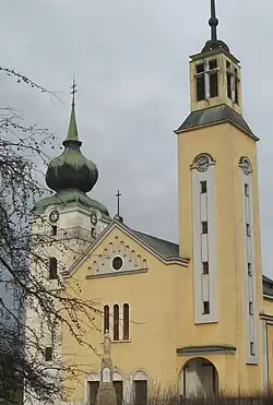 The Church of the Visitation of the Virgin Mary in Povazska Bystrica is the main church in the town, situated in the heart of the town gives the cross section between 14th-century architecture and the architecture of the first half of the 20th century in Slovakia. It was built by Ján Podmanitzky, the owner of the castle in gothic style. In 1913-1914 the tower of the church was covered with baroque "onion like" construction. From the original buildings only the presbytery and the northern perimetric wall still stand. Major reconstruction and enlarging began in 1940. Church's windows are filled with colourful stained glass filling created by Slovak artist Vincent Hložník and his wife Viera Hložníková in 1951. In front of the church is a sandstone statue of saint Mary to which church is dedicated. Inside are epitaphs of Zigmund Balassa, Alzbeta Zborovska, tombstone of Rafael Podmaintzky remains of caryatids and the depiction of the old town on the Balassa tombstone.