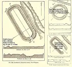 Loup Creek wall, "Trees of all sizes and varieties may be seen growing up through the heaps of loose stones which were once built into the wall. One of these which I particularly noticed was a red oak fully three feet in diameter and not less than four hundred years old. This would indicate that the wall had been abandoned at least that long if not longer. The mystery to be solved is who were the builders of this wall and why was it constructed. William Morris the first permanent settler of the county located in the vicinity of this wall in 1774 and his descendants claim that he was told by the Indians that the wall was there when the latter came into the Valley. It is quite clear to every inquiring mind that the Indians were not its builders but that it was no doubt constructed by the same race that built the mounds and inhabited the territory of the United States for centuries prior to its settlement by the Indians." Quote from George Wesley Atkinson, 1876 (Public Domain), Page 94, "History of Kanawha County: from its organization in 1789 until the present". - ^ Gage 2009:IV.