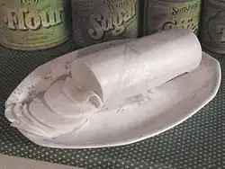 In Poland, farmer cheese is similar in consistency to cottage cheese.[9] The cheese is formed into a loaf.[9] It is sometimes referred to as "pot cheese."[10] | |