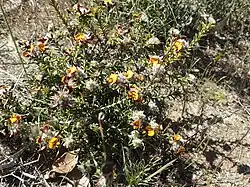 Pultenaea barbata is a species of flowering plant in the family Fabaceae and is endemic to the south of Western Australia. It is a prostrate or spreading, spindly shrub with hairy, needle-shaped leaves and yellow, red, orange or brown flowers with red or yellow markings.