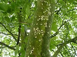 The adult scale insect resembles a limpet and remains stationary on the bark of its host tree where it feeds on sap. Although males can occur, the insects are normally all female, and reproduce by parthenogenesis.[4] In early summer, the mature female lays white, circular egg masses which become visible as they protrude slightly from under her brown scale. The eggs hatch into nymphs which crawl away from the mother along the branches to find foliage, where they start to suck sap. In the autumn, they return to the trunk and larger branches where they spend the winter as flat scales about 1 mm (0.04 in) long. They resume feeding in spring and are fully grown by early summer. There is a single generation each year and the adults die after reproducing.[2] This insect has glands that produce several forms of wax; some glands produce water-repellent wax that keeps the air passages leading to the spiracles open. Other glands produce long white filaments of wax that serve a function in the construction of the sac that surrounds the eggs. To avoid getting contaminated by its own honeydew, the scale insect has a six-bristled mechanism close to the anus, with which it can flick away its excrement.[5]