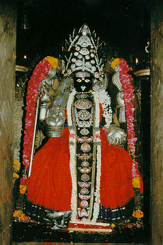 The temple, facing east, has three prakarams. It occupies an area of about one acre, It has a 90 feet high Rajagopuram, which is comparatively of recent origin. There are several mandapams here viz., the Arthamandapam, Mahamandapam, Narthanamandapam, Dwajamandapam, Alankaramandapam and the Thirumalaipathimandapam. There are in the temple paintings of the different forms of Ashta Sakthi viz., Gajalakshmi, Veera Lakshmi, Sowbhagya Lakshmi, Santhana Lakshmi, Dhana Lakshmi, Dhanya Lakshmi, Vidhya Lakshmi and Karunya Lakshmi. The Sukravaramandapam in the Amman Sannadhi has beautifully carved pillars. The Sthala Viruksham of the temple is “Vembu” (i.e., Neem Tree) and the sacred Theertham is Mani Muktha Nadhi (Vadavar River). The presiding deity of this shrine, Goddess Mariamman, is represented by anidol made of sand over anani-hill and covered with a silver kavacham. Sundays are considered to be the most auspicious days for worshipping the Goddess, when a large number of devotees, mostly women and children pay their homage.