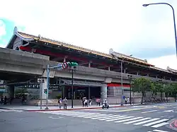 The two-level, elevated station structure has one island platform and three exits.[2] The station is situated between east of Beitou Road, and the beginning of Sanhe Road. The washrooms are inside the entrance area. On trains to Beitou, an announcement is made recommending passengers for stations north of Beitou to change trains at this station since Beitou does not offer same platform transfer between trains terminating at Beitou and trains continuing to Tamsui.