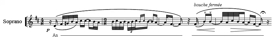 "Lahore" stands out from the other mélodies, lasting nearly four minutes. The Heine poem, subtly ironic in its parallel of the fir numbed with cold and the palm under the burning sun, allows Delage to evoke the Far East with luxurious arpeggios on the harp. The end of the poem opens on a very pure, unaccompanied vocalization (bars 43 to 55 in the score) in which the singer must adjust her tessitura and sing à bouche fermée ("with mouth closed"), then bouche ouverte ("mouth open"), "closing the mouth bit by bit". This novel effect stunned its first audiences.[19]