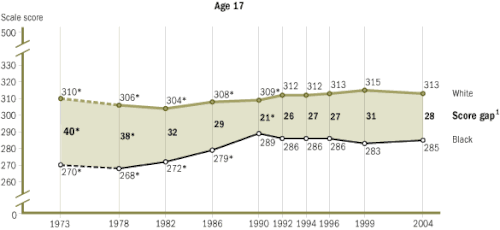 The National Assessment of Educational Progress (NAEP) has been testing seventeen-year-olds since 1971. From 1971 to 1996, the black-white reading gap shrank by almost one half and the math gap by almost one third.[32] Specifically, blacks scored an average of 239 points, and whites scored an average of 291 points on the NAEP reading tests in 1971. In 1990, blacks scored an average of 267, and whites scored an average of 297 points. On NAEP math tests in 1973, blacks scored an average of 270, and whites scored 310. In 1990, black average score was 289 and whites scored an average of 310 points. For Hispanics, the average NAEP math score for seventeen-year-olds in 1973 was 277 and 310 for whites. In 1990, the average score among Hispanics was 284 compared with 310 for whites.[21]