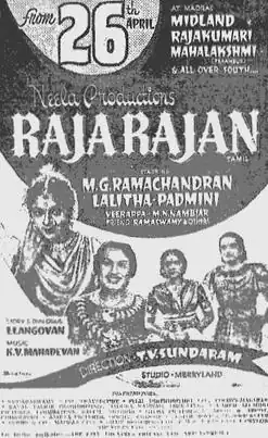 Raja Rajan (transl. King of kings)[2] is a 1957 Indian Tamil-language film starring M. G. Ramachandran, Padmini and Lalitha. The film was released on 26 April 1957,[3][4] and did not do well at the box-office, running for just above 50 days in theatres.