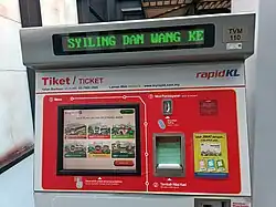 Rapid Rail implements an automatic fare collection system with stored value tickets and single journey tickets in the form of tokens. Tickets can be purchased either from ticket vending machines or at station counters found at all train statioms stations.[21] Turnstiles are located at the entrances to train platform, which separate the paid area and unpaid area of the stations. In 2011, Prasarana Malaysia announced a new ticketing system, effectively integrating the different rail lines which previously functioned as different systems. The new system allowed passengers to transfer seamlessly between rail lines at designated interchange stations without exiting the system and paying multiple fares or buying new tokens.[22]