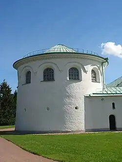 Ratnaya Palata (Russian: Ратная палата /rAht-naya pah-LAh-tah/ "Martial Chamber"[1]) is Russia's World War I museum[2] building in Pushkin town near Saint Petersburg, Russia. Designed for Romanov royal dynasty's 300th anniversary in Russian Revival architecture style together with the buildings of the church campus of the Sovereign's Cathedral of the Icon of Our Lady of Saint Theodore and the private royal railway terminal. Suggested, not long before World War I, to be built as a museum of Russian war history,[1] based on Elena Tretyakova's collection gift, the exhibition content, when the war was already under way in 1915,[1] was focused by Emperor Nicholas II on then current heroic deeds of Russian warriors, but the display, at first shown in the St Petersburg Admiralty building,[1] opened in Martial Chamber for only a short time before the end of Russian Empire in February 1917,[3] and was closed down a year later[3] by Soviet authorities. Having been used after that for unrelated purposes,[4] the Martial Chamber building was legally transferred to the Tsarskoye Selo Museum complex in 2008[1] and was cleared, restored, given a new collection of exhibits and reopened as modern Russia's first museum of World War I[2] by the centennial of its beginning in August 2014.[1] The exhibition is titled "Russia in the Great War" after a name for the war used at the time of its battles.[1]