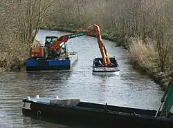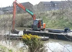 Since it was opened, the Ribble Link had been expensive to maintain. It suffered from flooding during the winter of 2003–2004, resulting in a lot of material being depositied in the channel, and scouring of some of the bywash weirs. The link was closed and Land and Water were employed to carry out dredging in March 2004. This was hampered by low water levels due to damage to the bywash weirs and by water supplies being limited by other work taking place on the Lancaster Canal. The whole of the link needed to be dredged, and further flooding took place while the work was in progress. The cost of the operation was £124,576.[43] The link was closed again during 2006, after voids appeared behind some of the lock structures. The work to fill the voids and to repair a lock bywash cost £360,000. Further dredging was required and cost £240,000. Some of this was achieved by conventional bucket dredging, where the material was removed and taken to landfill, but the use of 'cutter section' dredging was also trialled, after a licence was obtained from the Department for Environment, Food and Rural Affairs (DEFRA). This involved pumping the silt over the sea lock gate when the tide was going out so that it was carried into the Ribble, and following completion of the work, the link was re-opened on 6 April 2007. The effectiveness of cutter section dredging resulted in British Waterways applying for annual licences for the process. Sludge is brought into the lower section of the link by incoming tides,[44] and is a known problem on the Ribble. The cost of dredging to maintain the route to Preston Docks was one of the main reasons why they were closed in October 1981.[45]