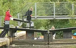 The lock gates were built at the Northwich works of British Waterways, and were installed by engineers from British Waterways.[33] Lock 9 consists of a single rotating gate, which is raised to retain water at a suitable level for navigation, and lowered into the bed of the canal to allow boats to pass when the level of the incoming tide reaches the level in the pound above the structure. In order to construct it, piling was used to create a coffer dam around the site. Once the concrete base had been poured, the gate was lowered into place.[34] Near the top of the navigation, a footpath had once passed beneath the railway line, but the tunnel had been closed when the Tom Benson road was built. In order to reconnect the path, a steel walkway was attached to the side of the railway arch through which boats pass, for which permission had to be obtained from British Rail.[35]