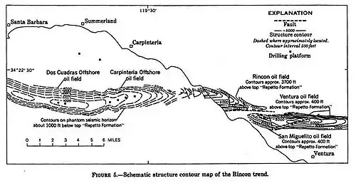 The Rincon Oil Field is a large oil field on the coast of southern California, about 10 miles (16 km) northwest of the city of Ventura, and about 20 miles (32 km) east-southeast of the city of Santa Barbara. It is the westernmost onshore field in a series of three fields which follow the Ventura Anticline, an east–west trending feature paralleling the Transverse Ranges. Discovered in 1927, the oil field ranks 36th in California by the size of its recoverable oil reserves. Although mostly depleted—retaining only about 2.5% of its original oil according to the California Department of Conservation—it remained productive, with 77 wells active as of early 2008.[1] Oil produced in the field flows through the M-143 pipeline, which parallels U.S. Highway 101 southeast to the Ventura Pump Station, at which point it joins a Tosco pipeline which carries it to Los Angeles area refineries.[2] As of 2009, the primary operators of the field were Occidental Petroleum for the onshore portion, and Greka Energy for the offshore portion. The offshore part of the field is operated mainly from Rincon Island.