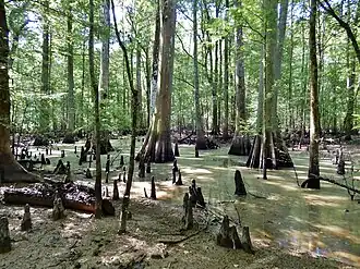 Refuge lands consist of bottomland hardwood forest interspersed with cypress-tupelo sloughs that includes forested wetlands in the lower 130 miles (210 km) of the Roanoke River from the Fall Line at Weldon, North Carolina downstream to the Albemarle Sound near Plymouth, North Carolina. The refuge includes part of an extensive wetland ecosystem that contains excellent examples of several southeastern plant communities and habitat types. These include levee forest, cypress-gum swamp, bottomland hardwoods, oxbows, beaver ponds and blackwater streams. These communities add to the rich mosaic of habitat types in the river's floodplain.