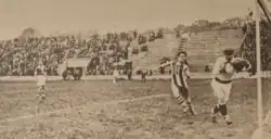 ![]() Robert Clavel charging Maurice Cottenet in the 1921 Coupe de France final | |||