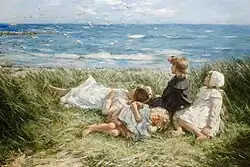 He was born in Edinburgh on 1 July 1855 the first son of George Hutchison, a brass-founder, and his wife Margaret Forman.[1] He was educated in Edinburgh.[2] After first training as a seal-engraver he was encouraged to pursue oil painting and trained under James Campbell Noble at the Trustees Academy on Picardy Place. He set up his own studio at 1 India Buildings (at the top of Victoria Street) in 1878 and was instantly successful, exhibiting at the Royal Scottish Academy in 1879 and at the Royal Academy in 1881.[3] He shifted quickly from empty seascapes, largely of the Fife coast, to genre paintings, usually of young girls sitting on the coast.[1]