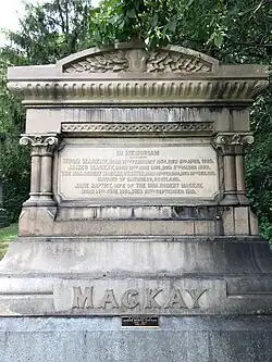 Robert Mackay is interred with his wife Jane in the Mount Royal Cemetery in Montreal. His daughter, Cairine Mackay Wilson, became the first woman appointed to the Canadian Senate. His home in Montreal's Golden Square Mile was demolished in 1930.