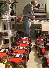 Balancing robots generally use a gyroscope to detect how much a robot is falling and then drive the wheels proportionally in the same direction, to counterbalance the fall at hundreds of times per second, based on the dynamics of an inverted pendulum.[60] Many different balancing robots have been designed.[61] While the Segway is not commonly thought of as a robot, it can be thought of as a component of a robot, when used as such Segway refer to them as RMP (Robotic Mobility Platform). An example of this use has been as NASA's Robonaut that has been mounted on a Segway.[62]