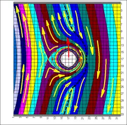 A three-dimensional representation of the Roche potential in a binary star with a mass ratio of 2, in the co-rotating frame. The droplet-shaped figures in the equipotential plot at the bottom of the figure define what are considered the Roche lobes of the stars. L1, L2 and L3 are the Lagrangian points where forces (considered in the rotating frame) cancel out. Mass can flow through the saddle point L1 from one star to its companion, if the star fills its Roche lobe.[1]
