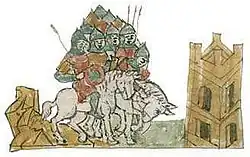 ![]() Miniature from the Radziwiłł Chronicle: Rogvolod-Boris rides to rule in Polotsk | |||||