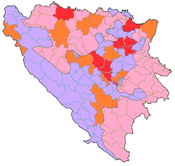 The largest number of Roma in Bosnia and Herzegovina live in the Tuzla Canton (15,000–17,000), of which a sizeable proportion in the municipality of Tuzla (6,000–6,500), as well as in Živinice (3,500), Lukavac (2,540). The Sarajevo Canton hosts around 7,000 Roma families, mostly in the municipality of Novi Grad, Sarajevo (1,200–1,500 families). The Zenica-Doboj Canton hosts between 7,700 and 8,200 Roma, of which 2,000–2,500 in the Zenica Municipality, 2,160 in Kakanj, 2,800 in Visoko. 2,000–2,500 Roma live in the Central Bosnia Canton, mostly in Donji Vakuf (500–550), Vitez (550) and Travnik (450). In the Una-Sana Canton there are between 2,000–2,200 Roma, of which 700 in the Bihać Municipality. In the territory of Herzegovina-Neretva Canton there are between 2,200–2,700 Roma, of which 450 in Konjic and 250 in Mostar. 2,000–2,500 Roma live in the Brčko District. In Republika Srpska live around 3,000–11,000 Roma, most of which in Gradiška (1,000), Bijeljina (541), Banja Luka (300), Prnjavor (200), Derventa (120).[5]