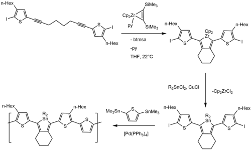In 2018, Staubitz and coworkers used the pyridine complex in combination with dialkyne complexes to form the zirconacyclopentadiene after loss of the pyridine and the bis(trimethylsilyl)acetylene. These zirconium metallacycles can then be transmetalated to create functionalized stannoles which Staubitz later used in Stille cross coupling reactions to form polymers with thiophene groups.[26][27][28]