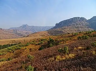 The main feature of the park is the Drakensberg Amphitheatre, a rock wall 5 kilometres (3.1 mi) long and up to 1,200 metres (3,900 ft) high, Mont-Aux-Sources peak where the Orange and Tugela rivers have their source,[4] and the 948-metre (3,110 ft) Tugela Falls.[5] A distinctive rock feature and popular hiking destination in the park is the so-called "Policeman's Helmet".