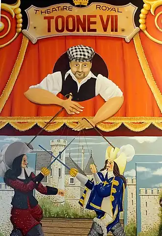 Since the theatre's humble foundation in the Marolles in 1830, and during its chequered history, nine showmen have succeeded one another in the Toone dynasty. The transition is not necessarily from father to son, nor even within the same family, but is often passed on by apprenticeship with the approval of the audience, the narrator being "enthroned" by the previous owner.[8] After Genty, the name Toone (Brussels' diminutive of Antoine) has been adopted by all of the theatre's unrelated (except two) successive owners.[2][3] In 2003, the eighth "generation", Toone VIII, took office.[15]