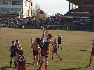 The role of the ruck in Australian rules is similar to a lock in rugby union contesting a line-out. The key differences are that with the exception of boundary throw-ins, the ball is almost always thrown straight up high into the air rather than horizontally, so in this respect, the ruck is similar to a basketball centre. The ruck needs to be able to control the ball by palm tap or fist with outstretched arms. Unlike rugby, the ruck must rely on vertical leap because lifting teammates is not allowed.[1] Australian football rucking often involves vigorous mid-air collisions with the opposing ruck.