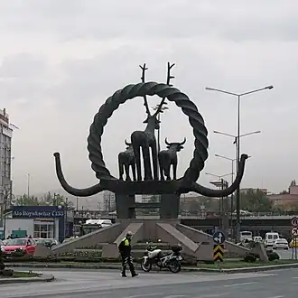 A massive replica of one of the Hattian Alaca Höyük bronze standards created by Turkish sculptor Nusret Suman (1905–1978) was erected in the middle of Sıhhiye Square in 1978.[2] The ancient Hattian cities were near Ankara and some of the most important Hattian, including the one that the sculpture is based on, are now displayed in Museum of Anatolian Civilizations.